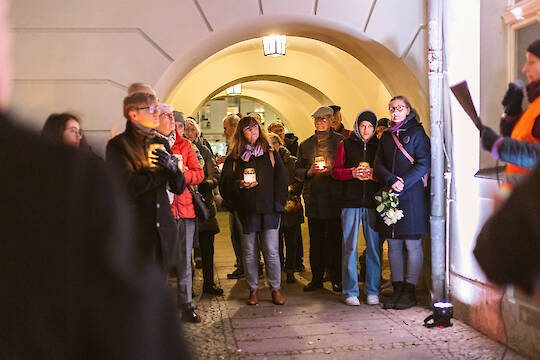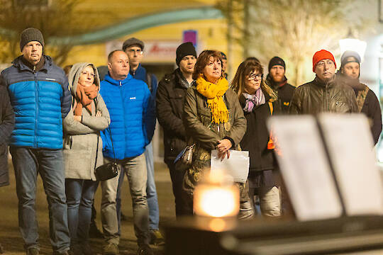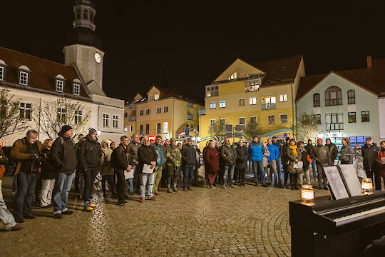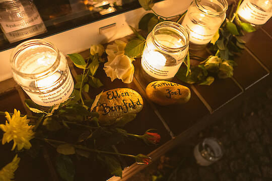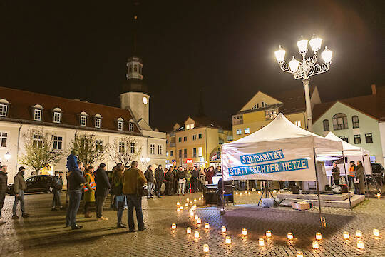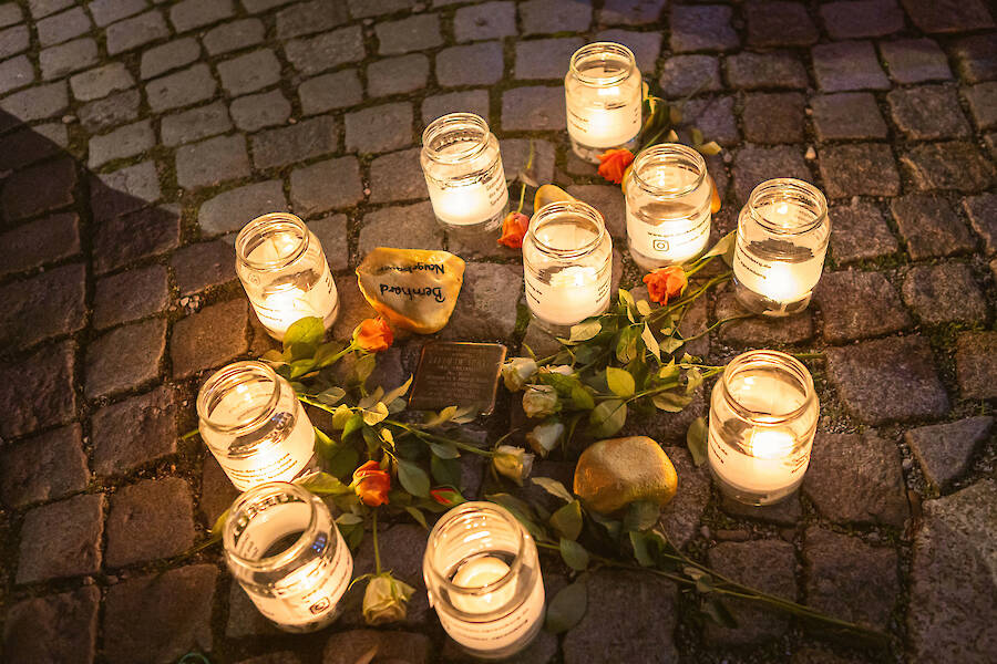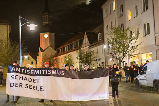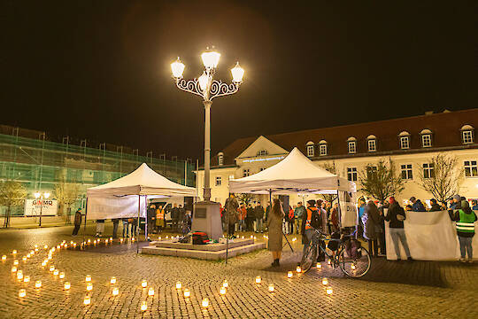 125 Menschen kamen am Abend des 9. November auf dem Spremberger Marktplatz und zu einem Stationenweg zusammen, um über 100 Menschen zu gedenken, die im Nationalsozialismus verfolgt wurden und zu dieser Zeit in Spremberg lebten oder aus Spremberg stammten.