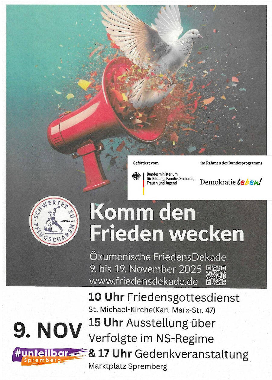 „Komm den Frieden wecken!” Unter diesem Motto feiern wir im Rahmen der Ökumenischen Friedensdekade einen besonderen Gottesdienst am Sonntag, den 9. November, 10.00 Uhr in die St. Michaelkirche ein. Am Nachmittag können Sie auf dem Spremberger Marktplatz eine Ausstellung zu den Schicksalen von Menschen in Spremberg während der NS-Zeit und 17.00 Uhr unsere Gedenkveranstaltung dazu besuchen.