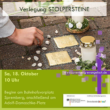 Nehmen Sie Anteil, wenn wir am Samstag, den 18. Oktober, 10.00 Uhr auf dem Bahnhofsvorplatz in Spremberg STOLPERSTEINE für die Eheleute Tschickert verlegen, die im Widerstand gegen das NS-Regime arbeiteten. Anschließend erhält am Adolf-Damaschke-Platz Reinhold Arndt einen Stein, der aus ungeklärten Gründen ins Konzentrationslager gebracht und getötet wurde.