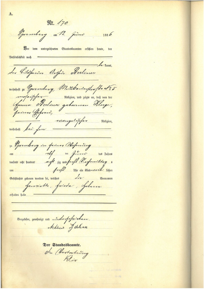 | 11.06.1886 | Geburt – von Henriette Frieda Helene Berliner in Spremberg, Muskauer Straße 5 |