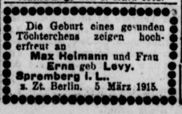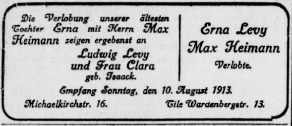 Erna Levy wird am 14. Mai 1890 geboren.1 Sie ist das erste von vier Kindern der Eheleute Ludwig (auch Louis) und Clara Levy. Die Familie zieht umher – nach Finsterwalde und Reichenberg (heute Liberec, Tschechien) und wieder nach Berlin, wo sie einige Jahre in der Michaelkirchstraße 16 bleiben. Dort lernt er die 23-jährige Erna den Kaufmann Max Heimann kennen, der wie sie am Tiergarten wohnt. Max ist 15 Jahre älter als Erna, als die beiden am 11. November 1913 in Berlin heiraten. Als 1915 ihre Tochter in Berlin zur Welt kommt, heißt es auf der Geburtsanzeige: Spremberg in der Lausitz, zur Zeit in Berlin. Ursula bleibt ihr einziges Kind.2