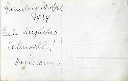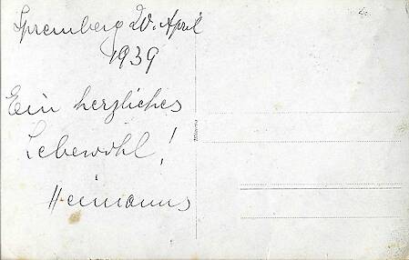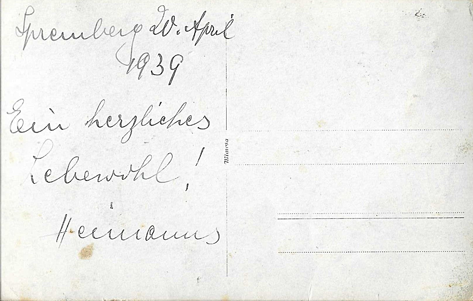 Den Eheleuten Heimann gelingt ebenfalls die Flucht, gewissermaßen im letzten Moment. Am 20. April 1939 versenden sie aus Spremberg eine letzte Postkarte an Hedwig Hornich, die bei Görlitz wohnt und jahrelang als Kindermädchen in der Familie tätig war.10