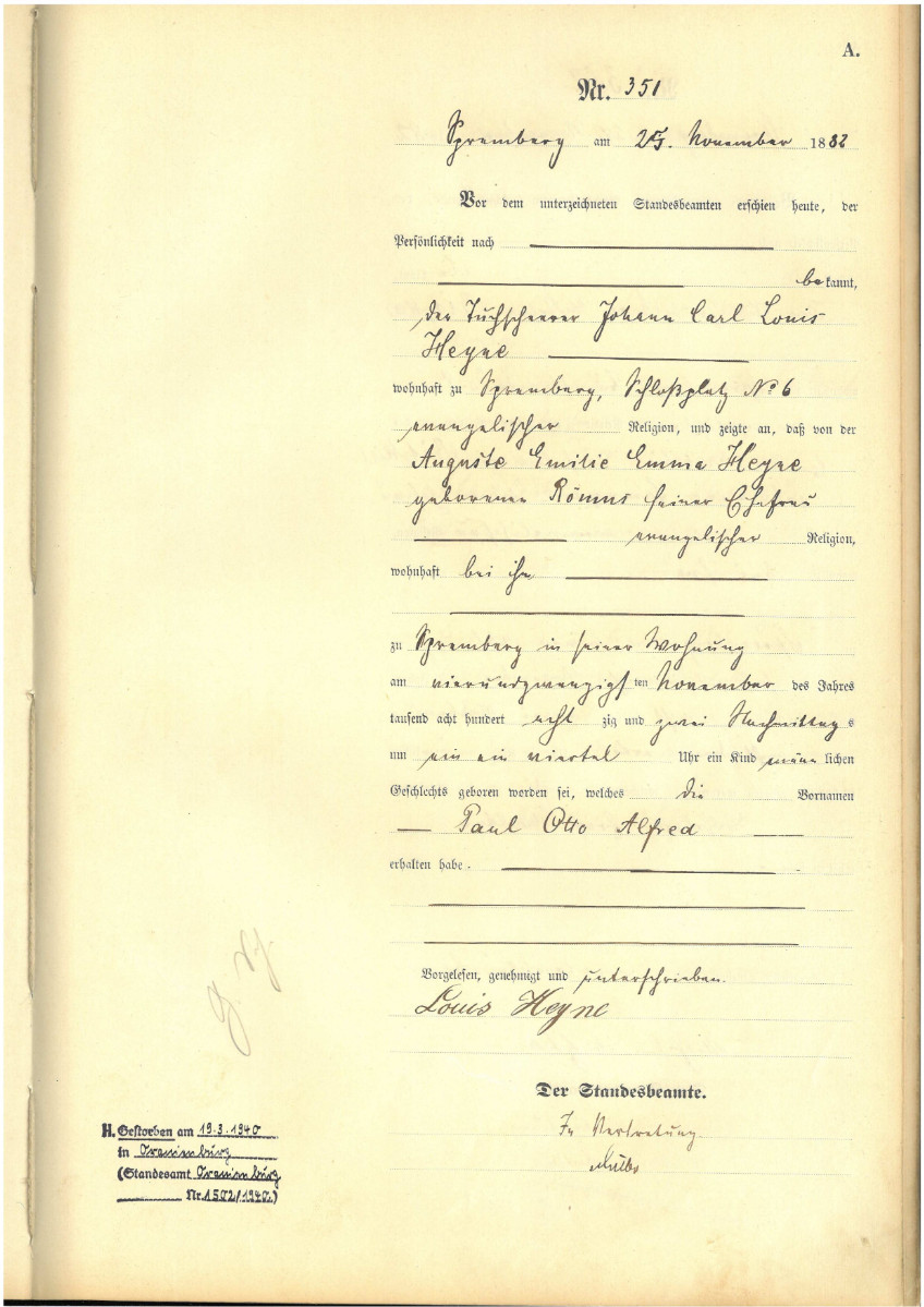 Paul Otto Alfred Heyne erblickt am 24. November 1882 im Schlossplatz 61 in Spremberg das Licht der Welt und als er 16 Tage alt ist, wird er in der Stadtkirche evangelisch getauft. Seine Eltern sind der Tuchscherer Louis Heyne und dessen Ehefrau August Emilie Emma geb. Römus. Alfred wächst mit min. zwei Geschwistern auf.2