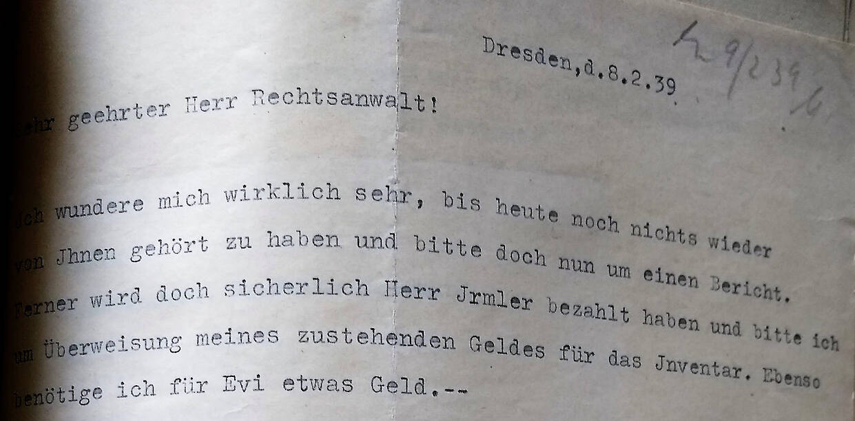 "Ich wundere mich wirklich sehr, bis heute noch nichts wieder von Ihnen gehört zu haben und bitte doch um einen Bericht. Ferner wird doch sicherlich Herr Irmler bezahlt haben und bitte ich um Überweisung meines zustehenden Geldes für das Inventar. Ebenso benötige ich für Evi etwas Geld. [...] Ich habe immer gedacht, mein Schwager kommt jeden Tag zurück, da er aber bis heute noch nicht da ist und ich ernstlich vor der Auswanderung stehe, bitte ich Sie, mir umgehend das Geld zu senden.“5