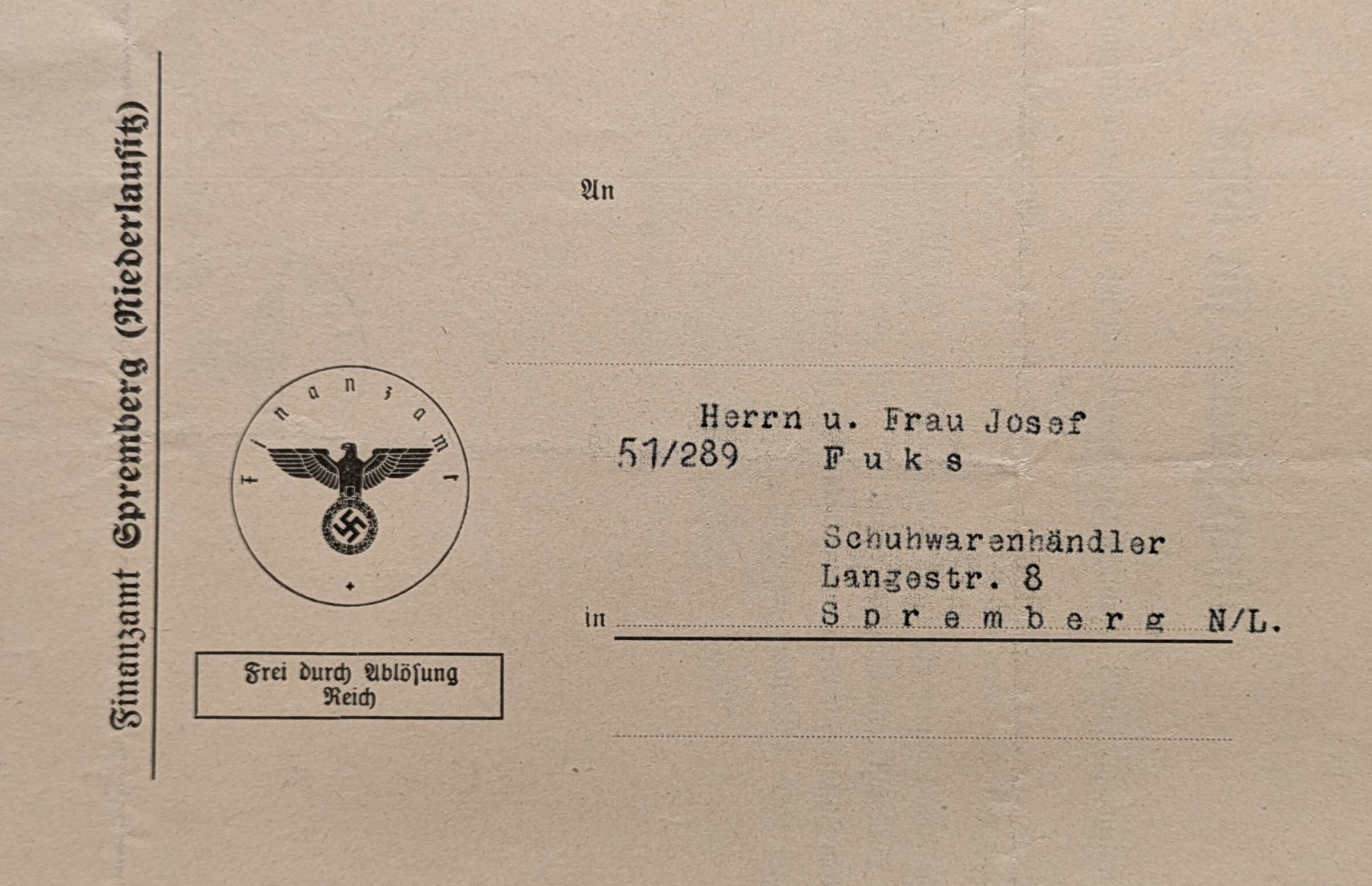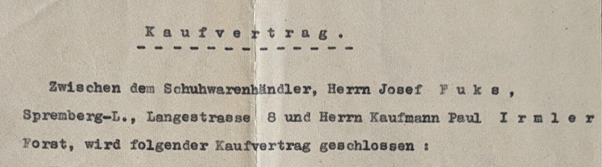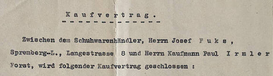 “Schuh-Fuks“ geht erst an seine Ehefrau Hilde über. Doch Hilde scheint keine Zukunft für sich und ihre höchstens vier Jahre alte Tochter Evi in Spremberg zu sehen. Sie zieht zurück zu ihren Eltern nach Dresden und übergibt das Geschäft in der Langen Straße wieder an ihren Schwager Chaim Jossek. Der verkauft es schließlich im Oktober 1938 an den Schuhwarenhändler Paul Irmler aus Forst.8 Ein wirtschaftliches Auskommen ist für ein jüdisches Geschäft in Spremberg zur Unmöglichkeit geworden. Mit dem Verkauf schließt das letzte Geschäft in Spremberg, das je von einem Juden geführt wurde.