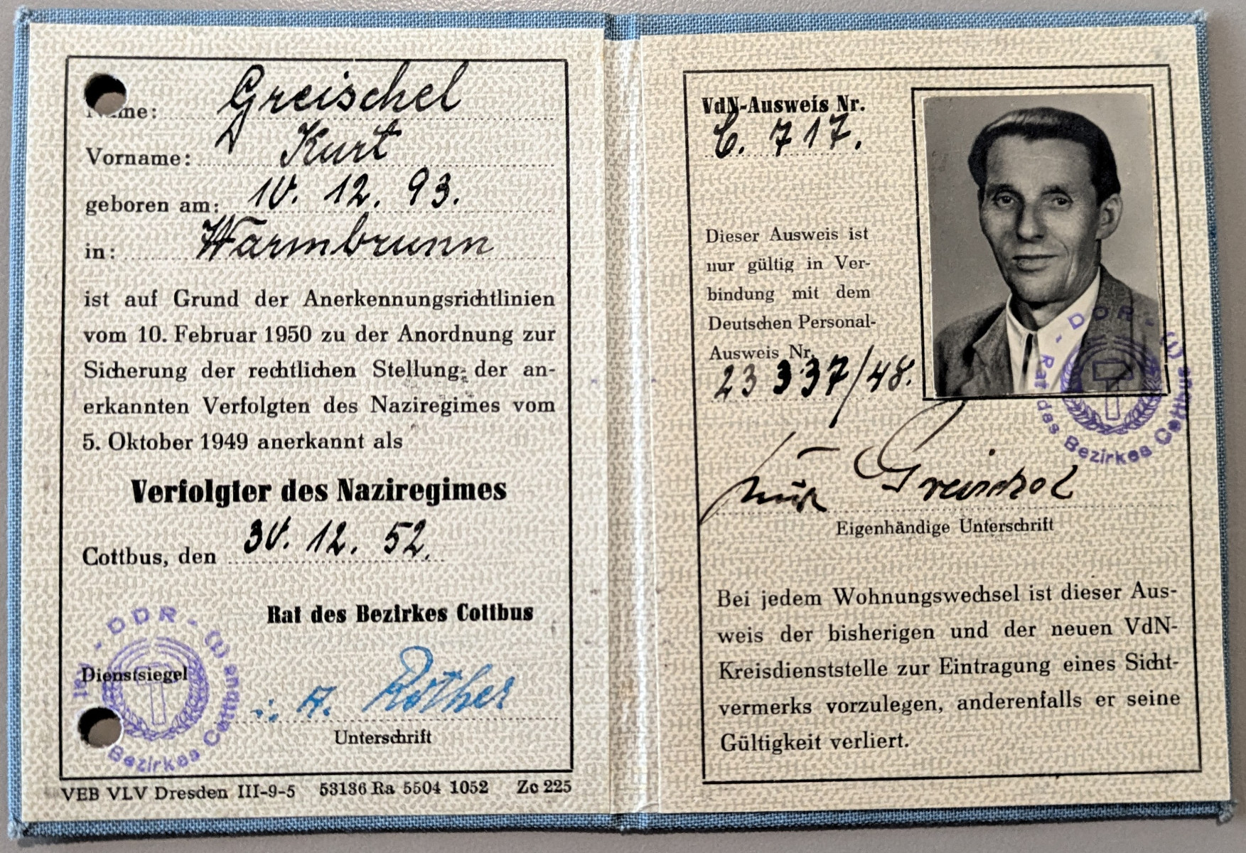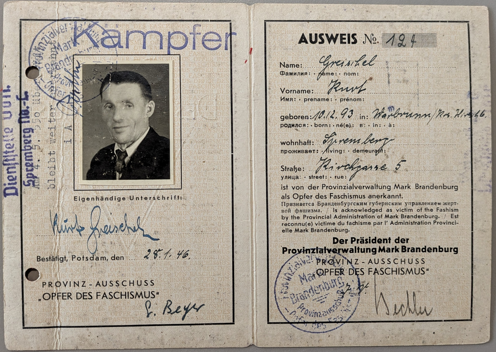 Nach Kriegsende baut Kurt die Spremberger Kreispolizei auf und wird deren Chef.15 In der Vereinigung der Verfolgten des Nationalsozialismus übernimmt Kurt in Spremberg die Aufgabe des Kassenwarts. Seine Frau und er werden in der neu gegründeten SPD tätig, später für die SED.16 Kurt wechselt zum Kreissozialamt, wo er auch das Umsiedlerwesen und das Wohnungsamt betreut.17 Spätestens ab 1950 wohnen sie im Schweizergarten 8 in Spremberg.