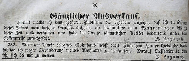 | 10.03.1855 | Julius Lagowitz gibt sein Geschäft am Spremberger Markt auf und verkauft sein dortiges Haus |