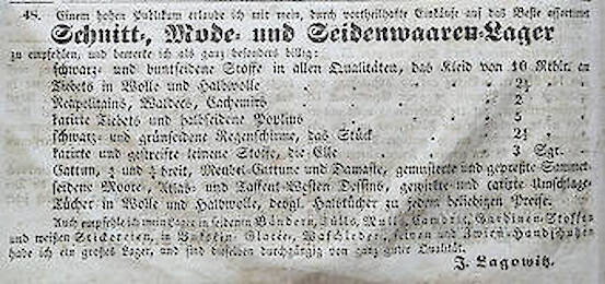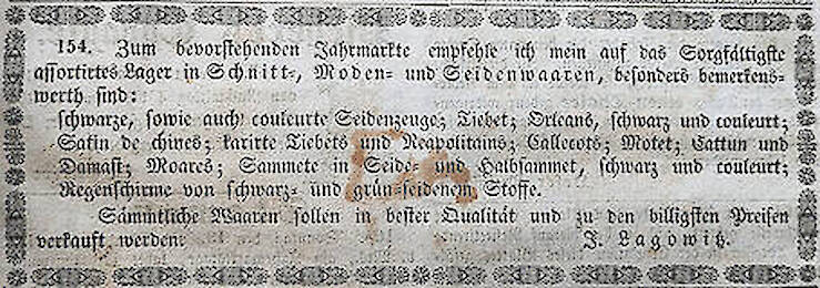 Am 1. April 1851 eröffnet der Kaufmann Julius Lagowitz am Spremberger Markt sein Geschäft für Schnitt-, Mode-, Putz- und Leinen-Waren.1 Annoncen im Spremberger Kreisblatt belegen, dass Familie Lagowitz die jüdischen Feiertage ehrt und an solchen Tagen ihr Geschäft geschlossen hält.2