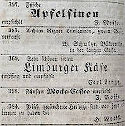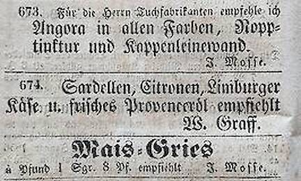 Itzig und Fanny sind damit die ersten in Spremberg lebenden Juden, die bisher namentlich bekannt sind. Am 15. Oktober 1830 bekommt Itzig die Erlaubnis, in Spremberg ein Geschäft zu eröffnen. Da die Spremberger Bürger dagegen beim Landrat protestieren, verzögert sich aber die Eröffnung.2 Itzig betreibt sein Geschäft in der Lange Gasse (heute Lange Straße) mit einem breiten Angebot: Textilien, Bettfedern, Matjes-Heringe, exotische Nüsse und Citrusfrüchte, Pflanzensamen, eiserne Ringe für Fässer, Stiefeleisen, und mehr.3 Aus Zeitungsannoncen ist ersichtlich, dass sie ihr Geschäft an jüdischen Festtagen geschlossen halten.4