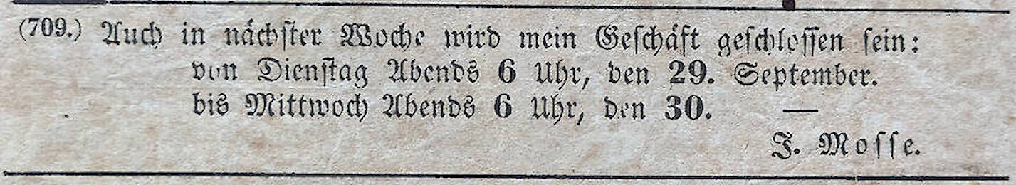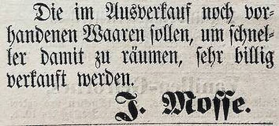 | Oktober 1872 | Geschäftserweiterung von Itzig Mosse mit Bank- und Wechselgeschäft in Spremberg |